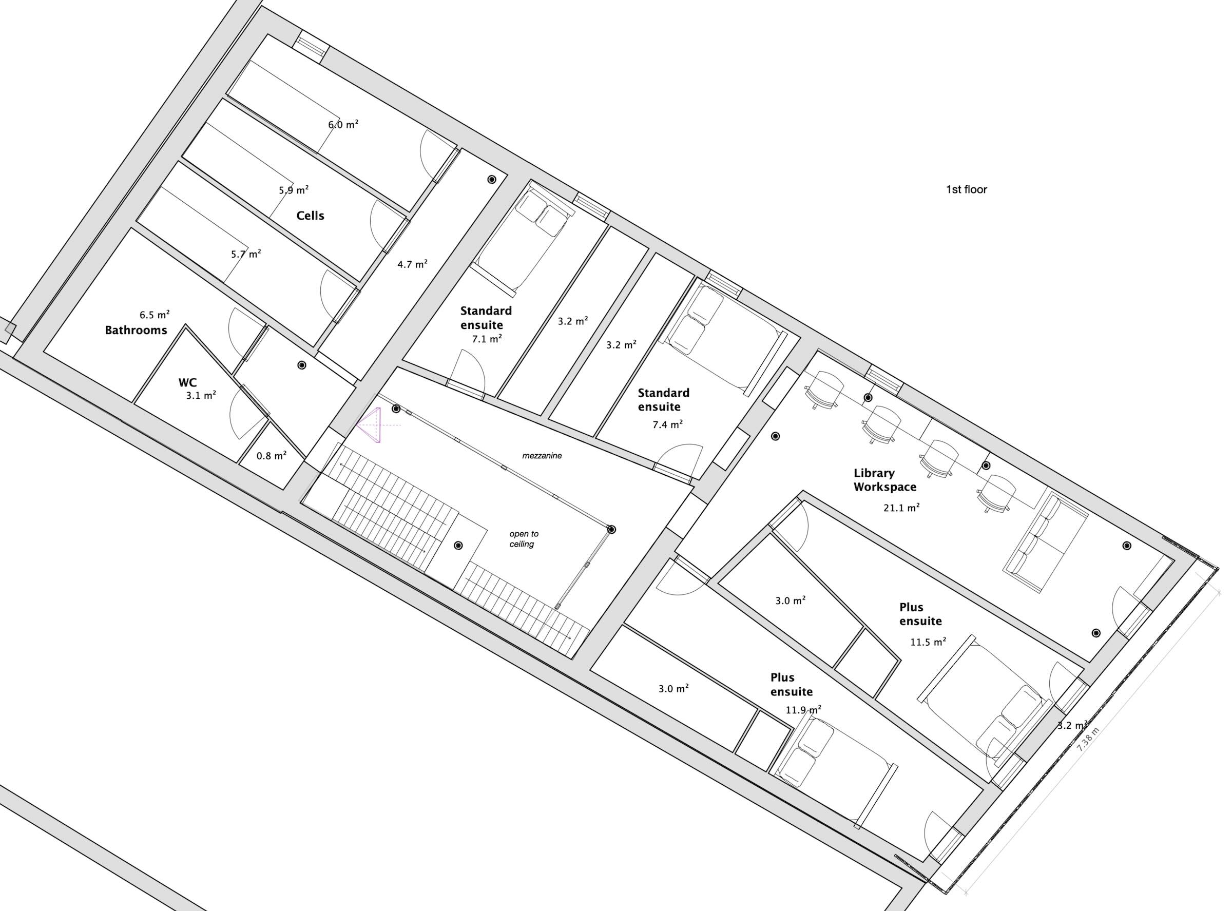 ✧ b. less common space: 4 standard ensuites at the front each with balcony, also multi-use lounge in the middle