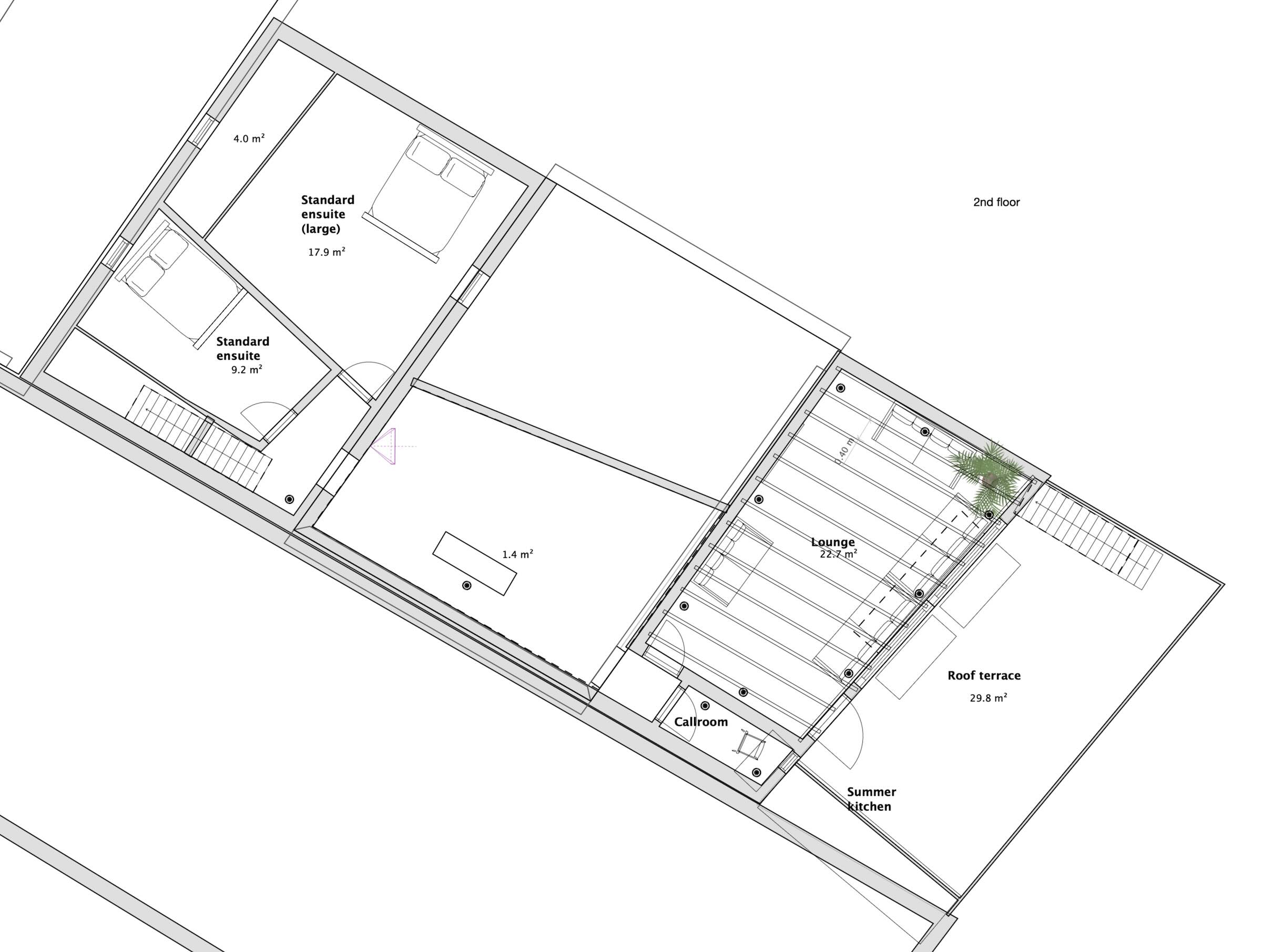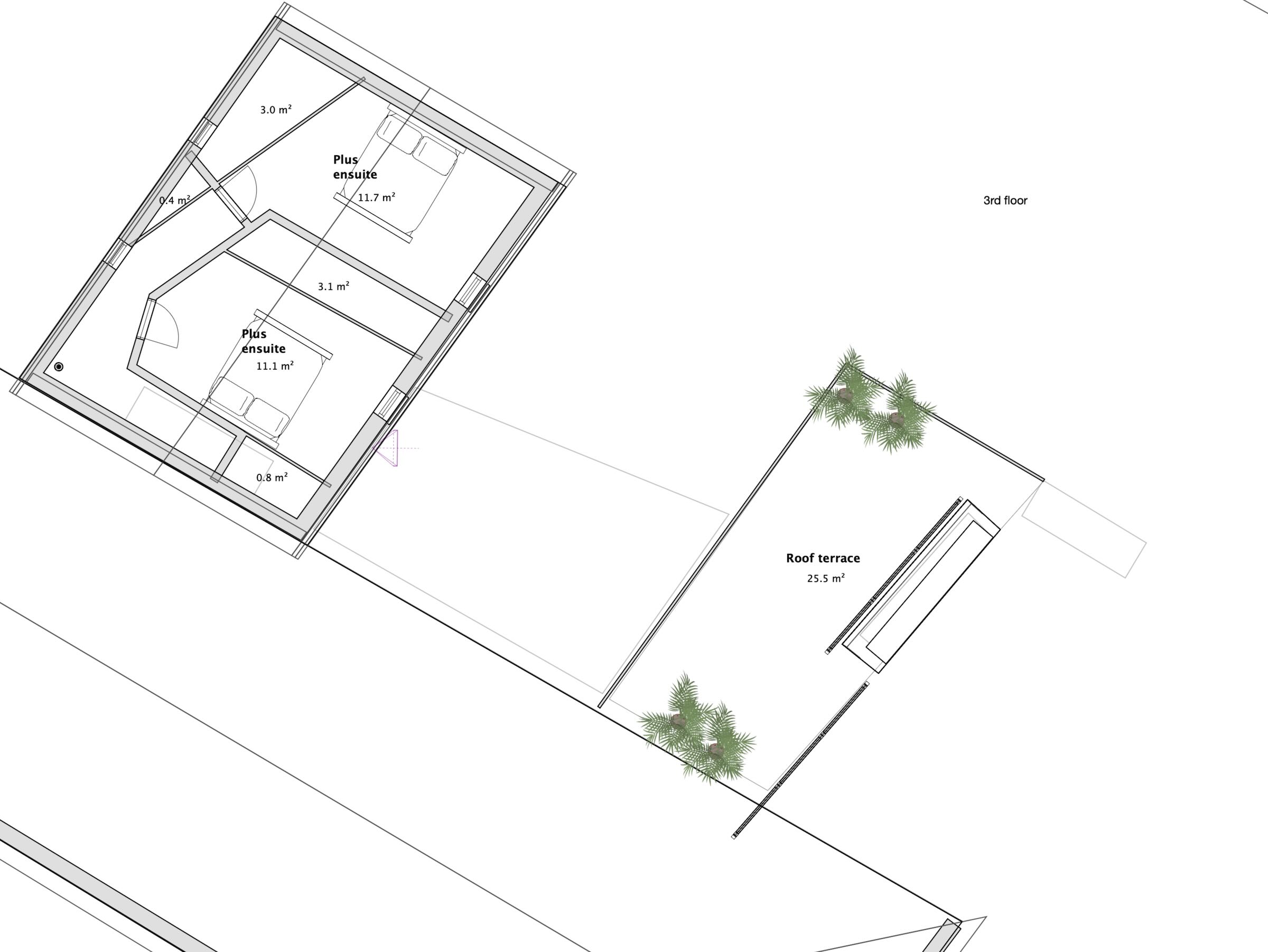 ✧ d. rebuild middle: would gain an extra floor above opening onto the roof terrace, this would add 2–3 rooms, and could regardless be undertaken later, 2 rooms would be on the 1st, with the lounge moved up alongside one room
