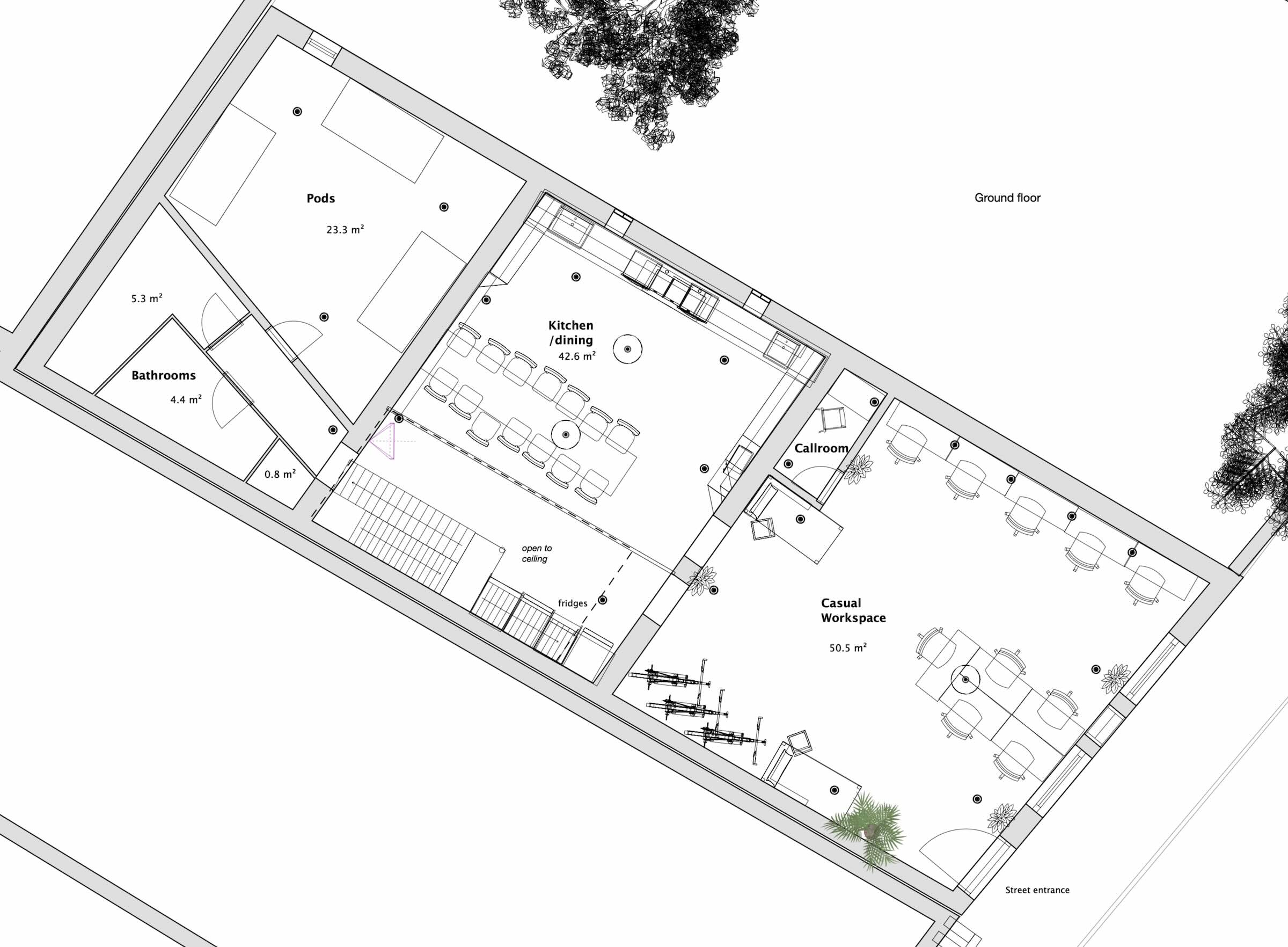the back section where pods would be built is actually 2 floors, so could either have an extra high ceiling, else would have to be split, and would allow a circa 1.6m wide open spacein front of them where there's two small windows for some natural light, but would be decorated with warm lighting features